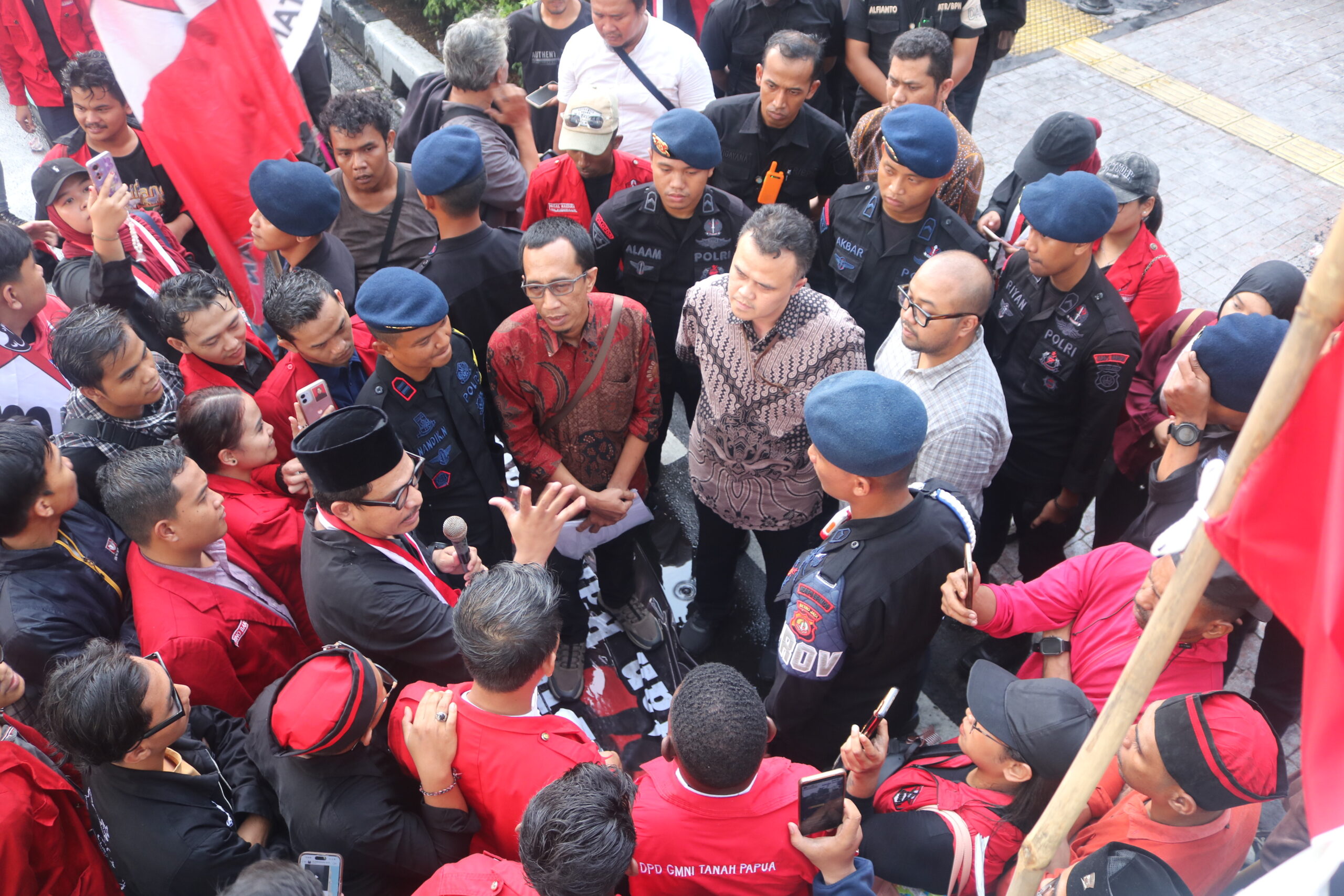 Ketua Umum DPP GMNI, Sujahri Somar, memimpin langsung aksi tersebut dan menyampaikan dua tuntutan utama kepada kementerian.