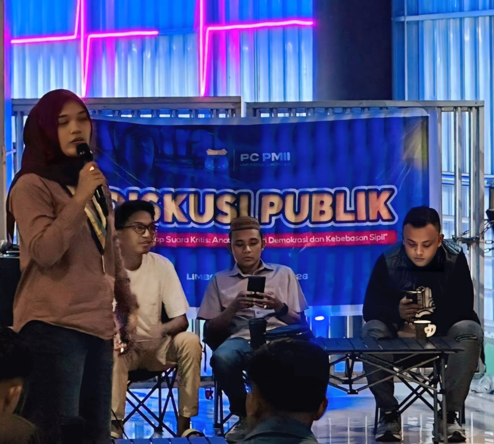 Ketua PC PMII Kabupaten Gorontalo, Puspa Sari Mookoginta, dalam sambutannya menegaskan bahwa Indonesia sebagai negara demokrasi menjunjung tinggi kebebasan berpendapat dan hak sipil. Namun, ia menilai kondisi tersebut tengah menghadapi ancaman serius, terutama pasca insiden penyiraman air keras terhadap seorang aktivis, Andri Yunus.